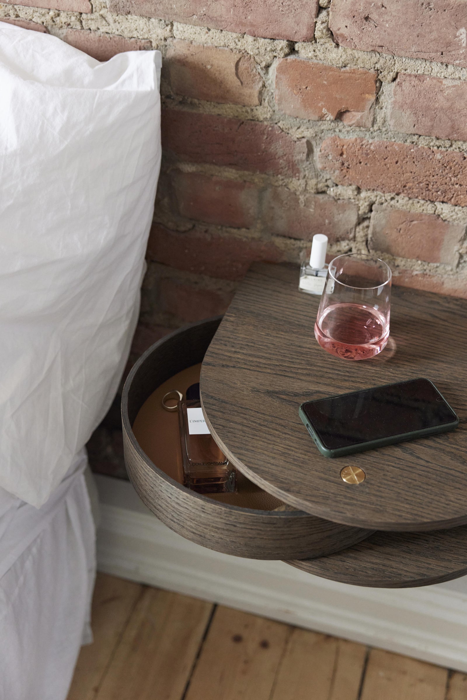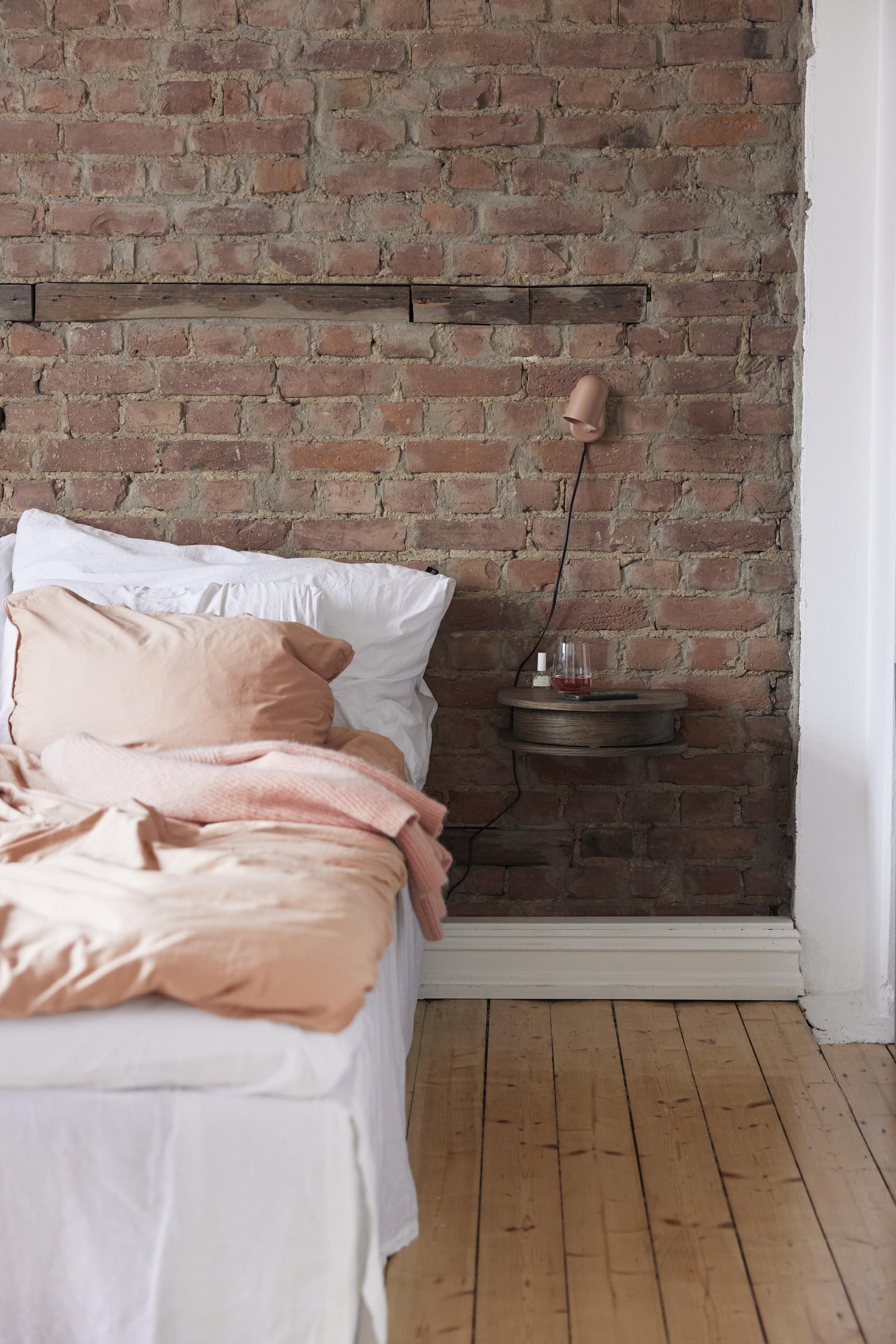 Effortless elegance. Exposed brick meets soft lighting, creating a bedroom that feels both raw and refined.